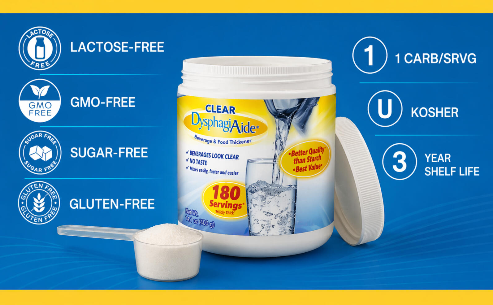 Clear DysphagiAide® Jar is a xanthan gum thickener for people with swallowing difficulty. It helps make drinks safer to swallow by thickening hot and cold liquids without changing taste or clarity. The jar is suited for regular, everyday use in hospitals and at home under clinical guidance.