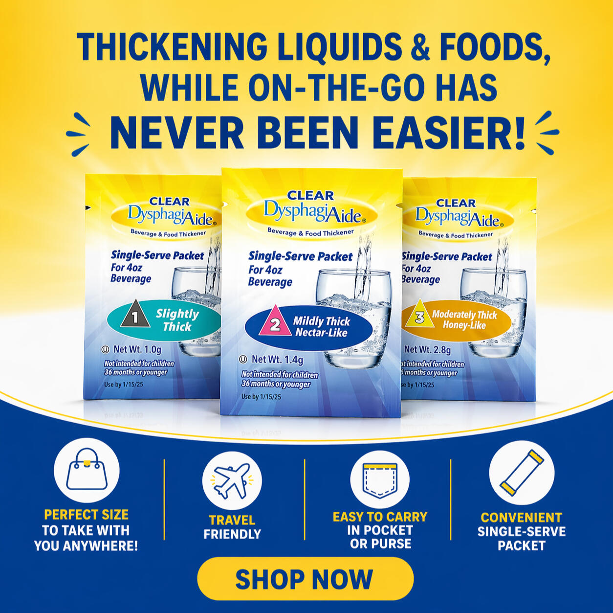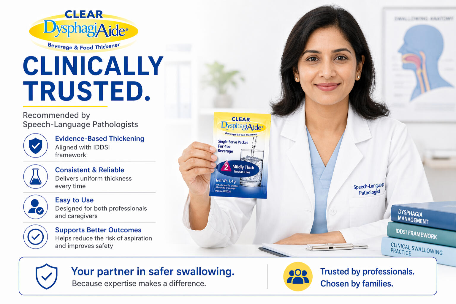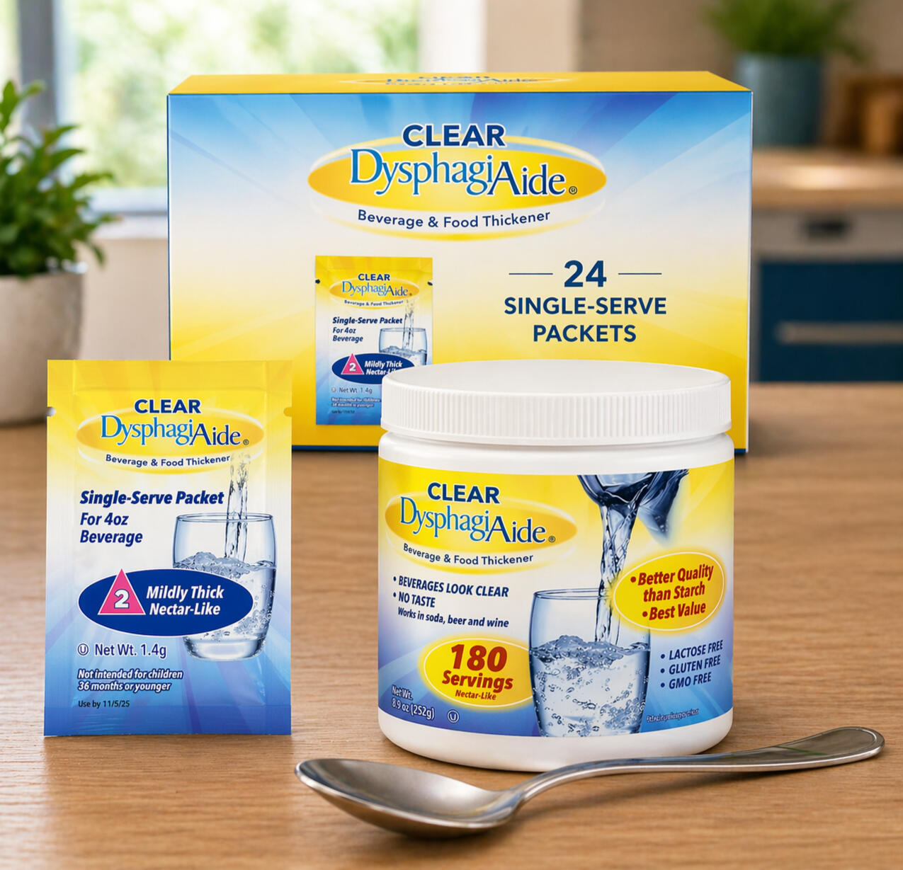 Clear DysphagiAide® Sachets are single‑serve packs of xanthan gum thickener. Each sachet is pre‑measured to help prepare safer‑to‑swallow drinks quickly and accurately at bedside, in clinic, or while travelling. They dissolve fast and keep liquids clear and close to their original taste.